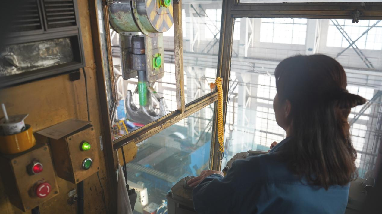 重裝車間高懸的“天車”駕駛艙內,駕駛員陳媚媚正全神貫注,借助對講機與地面人員的手勢信號,上下、左右緩緩推拉操作桿,鐵鉤吊著幾十噸重的鍛壓部件左右移動,成功落在了作業(yè)地點。