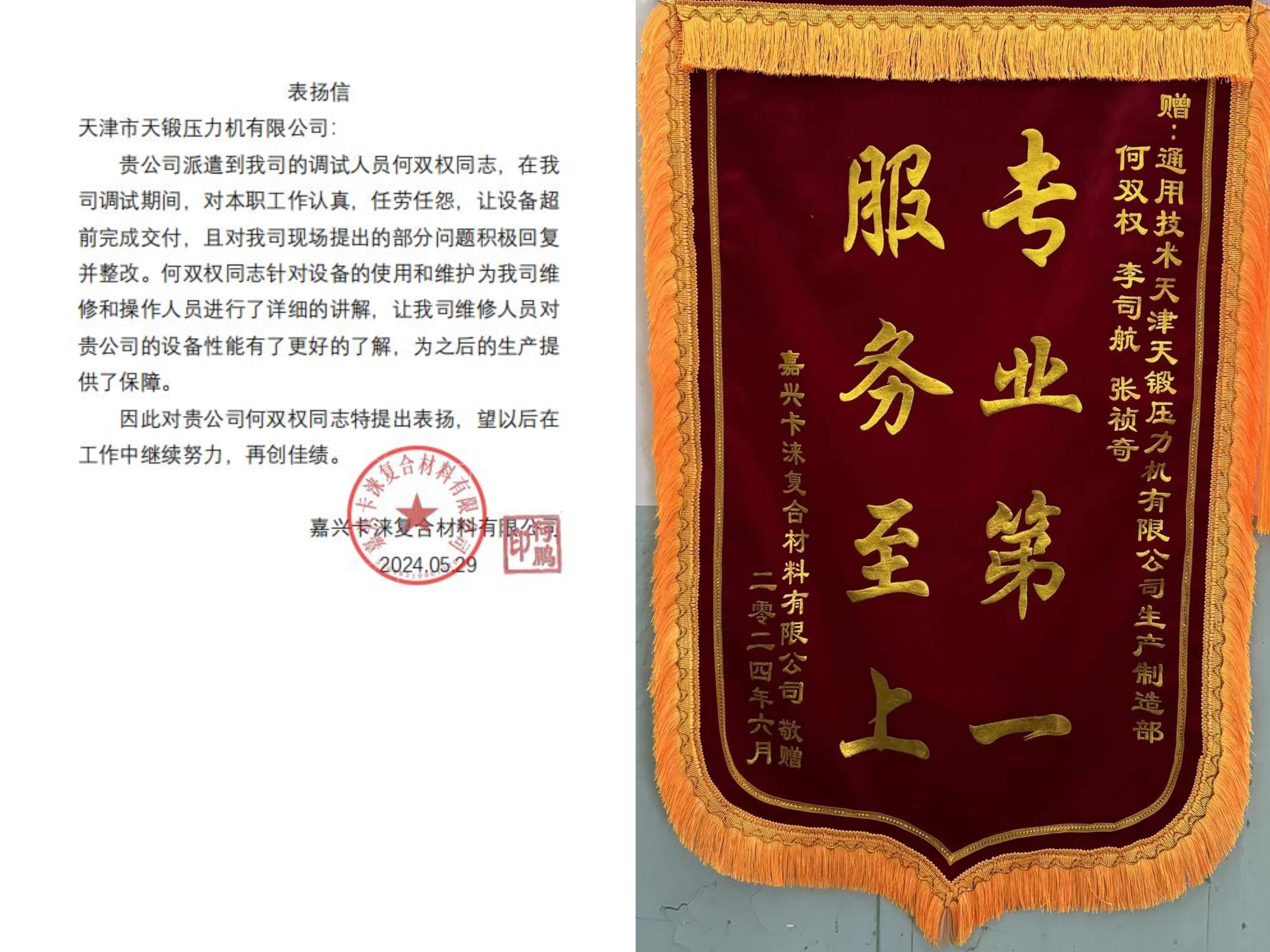 3月,公司接到嘉興卡淶復(fù)合材料有限公司項(xiàng)目加急交付需求,生產(chǎn)制造部派出專業(yè)技術(shù)人員何雙權(quán)、李司航、張禎奇到客戶現(xiàn)場調(diào)試兩條生產(chǎn)線設(shè)備。為及時有效滿足客戶需求,我司工作人員現(xiàn)場開展交叉作業(yè),主輔機(jī)聯(lián)動配合,提前4天完成兩條生產(chǎn)線的交付要求,為第一批產(chǎn)品順利生產(chǎn)提供了重要保障??蛻魧F(tuán)隊(duì)成員的工作態(tài)度和高質(zhì)量交付的產(chǎn)品十分滿意,主動致以感謝信和錦旗,表達(dá)對公司和安調(diào)工程師的感謝與贊揚(yáng)。